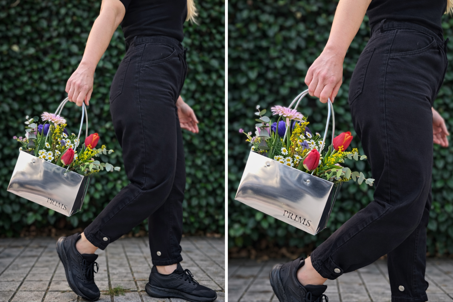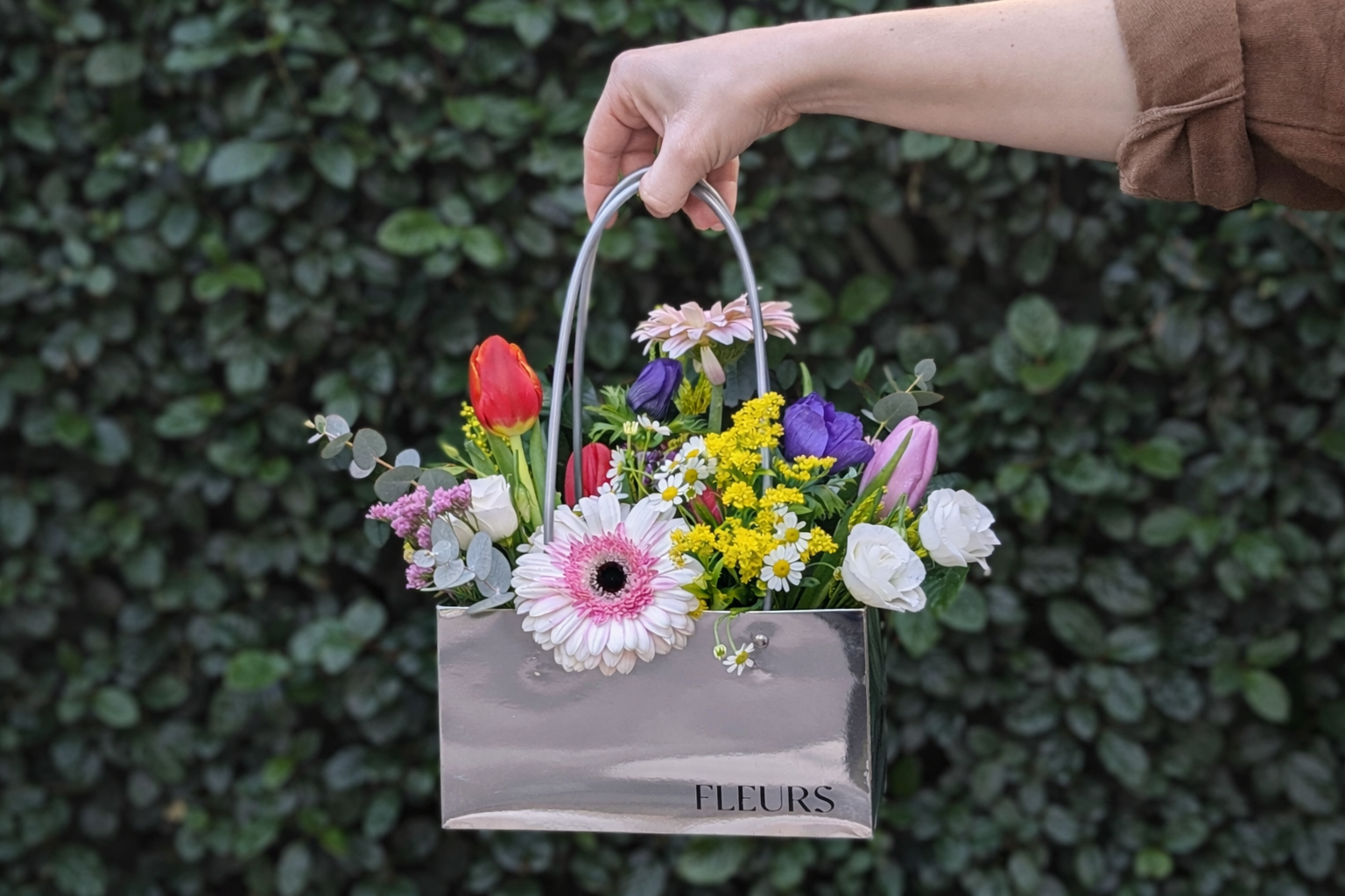 Αυτή η εντυπωσιακή σύνθεση περιλαμβάνει μια πολυτελή ασημί τσάντα με καθρέφτη φινίρισμα, γεμάτη με φρέσκα, πολύχρωμα λουλούδια. Τουλίπες, μαργαρίτες, εποχιακά άνθη και πράσινα στοιχεία συνδυάζονται αρμονικά, δημιουργώντας ένα ρομαντικό και χαρούμενο αποτέλεσμα.